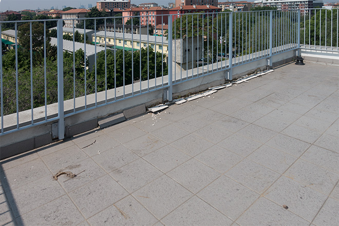 Zoccolino del terrazzo distaccato. Ritornati nello spazio comune gigando a destra si arriva al giardino penzile