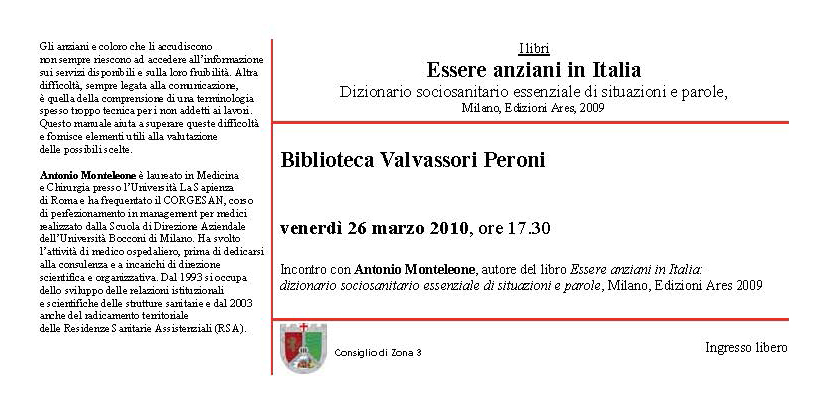 Essere anziani in Italia : dizionario sociosanitario essenziale di situazioni & parole / Antonio Monteleone ; in collaborazione con Carla Gaddi. – Milano : Ares, 2009. – 446 p. ; 21 cm è possibile chiedere il libro in prestito alla Biblioteca. Collocazione: VAL.362.6.MONT