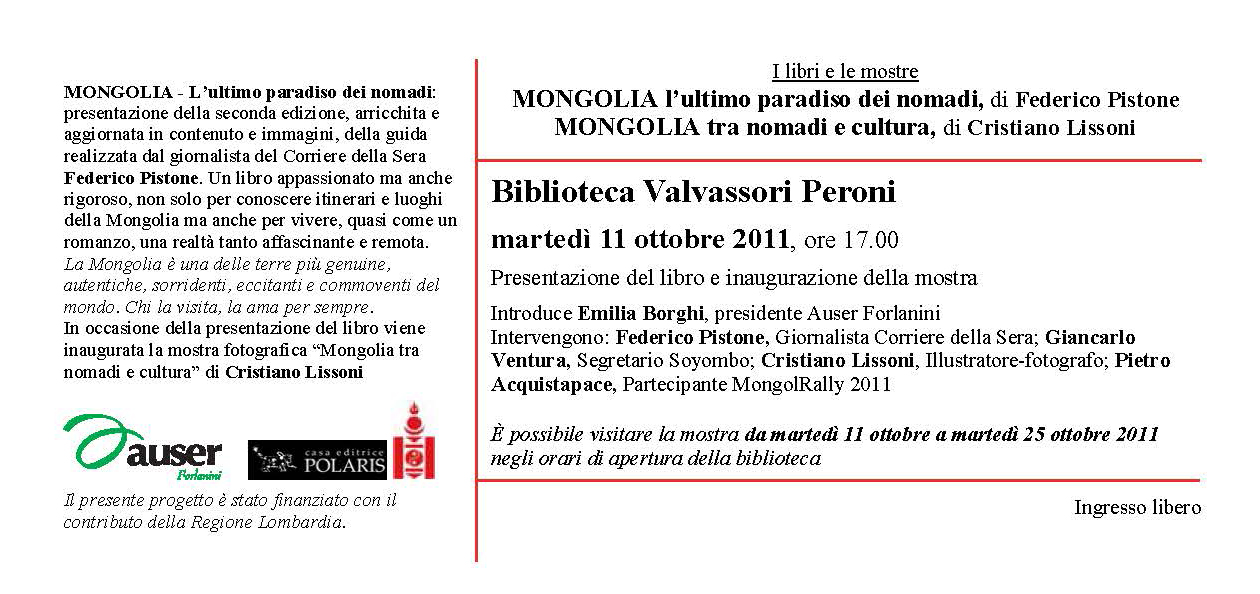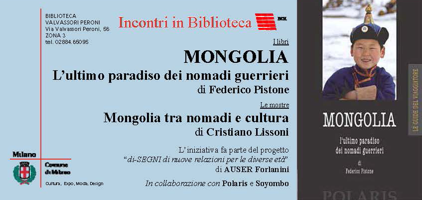 Mongolia : l’ultimo paradiso dei nomadi guerrieri / Federico Pistone. – Vicchio di Mugello : Polaris, 2008. – 411 p., [16] c. di tav. : ill. ; 21 cm. E’ ammesso al prestito presso la biblioteca. Collocazione: VAL.915.17.PIST