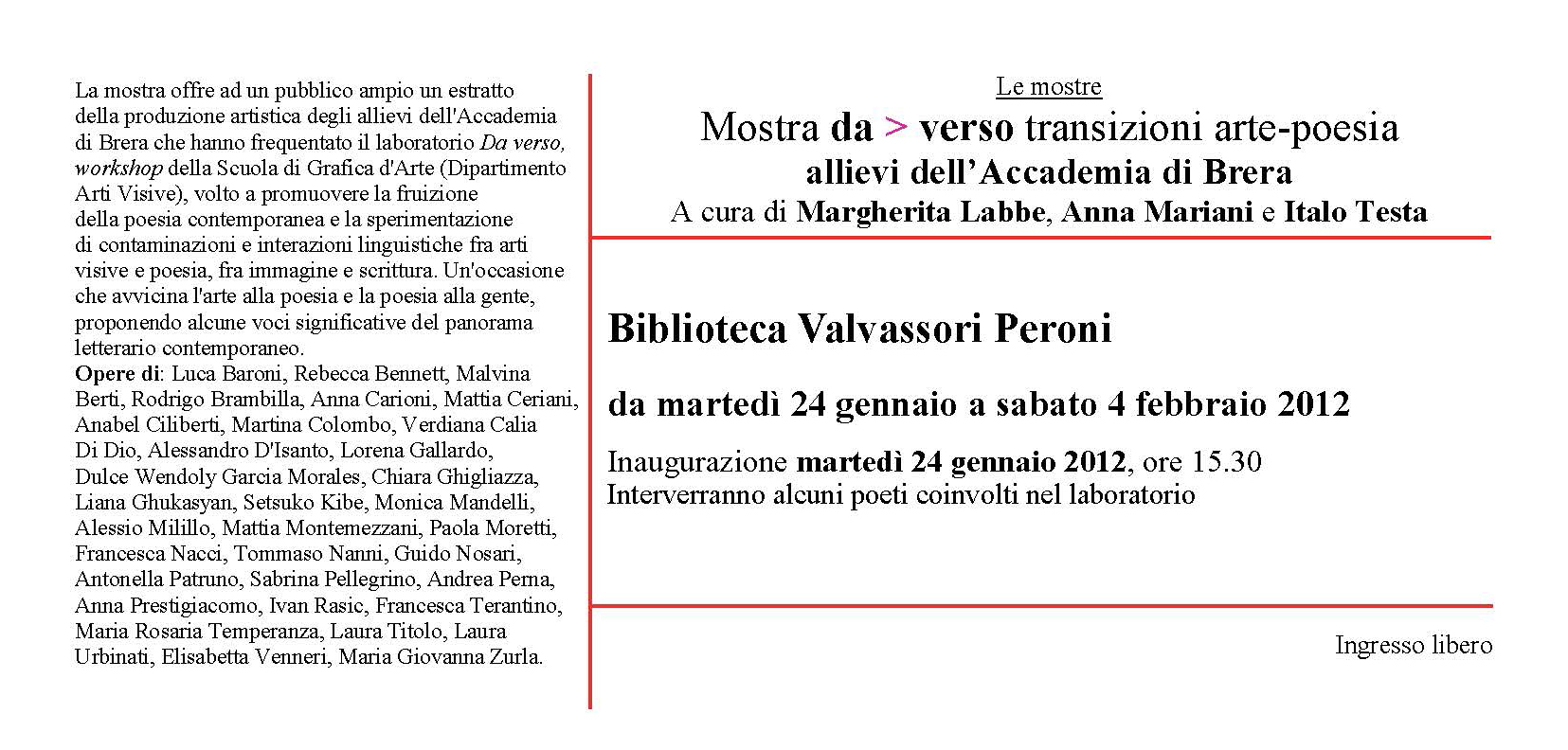 24 gennaio – 4 febbraio MOSTRA DA>VERSO TRANSAZIONE ARTE-POESIA