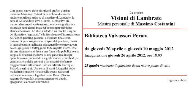 Questa voce è stata pubblicata in Arte, Biblioteca Valvassori Peroni, Mostra e contrassegnata con Massimo Costantini. Contrassegna il permalink.