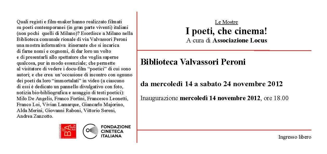 Questa voce è stata pubblicata in Arte, Biblioteca Valvassori Peroni, Mostra, redazione e contrassegnata con ALDA MERINI, Andrea Zanzotto, Associazione Locus, FOndazione cineteca italiana, Francesco Leonetti, Franco Fortini, Franco Loi, Giancarlo Majorino, Giovanni Riboni, Milo De Angelis, Vittorio Sereni, Vivian Lamarque. Contrassegna il permalink.