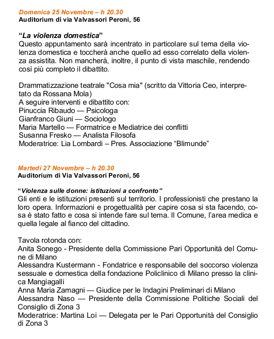 Il CdZ 3 ha organizzato, tra il 22 e il 27 novembre, nell’Aula magna del Liceo Virgilio di P.zza Ascoli e nell’auditorium di via Valvassori Peroni 56, in collaborazione con associazioni e comitati di donne che operano in zona 3, quattro serate in concomitanza con la Giornata internazionale contro la violenza sulle donne.