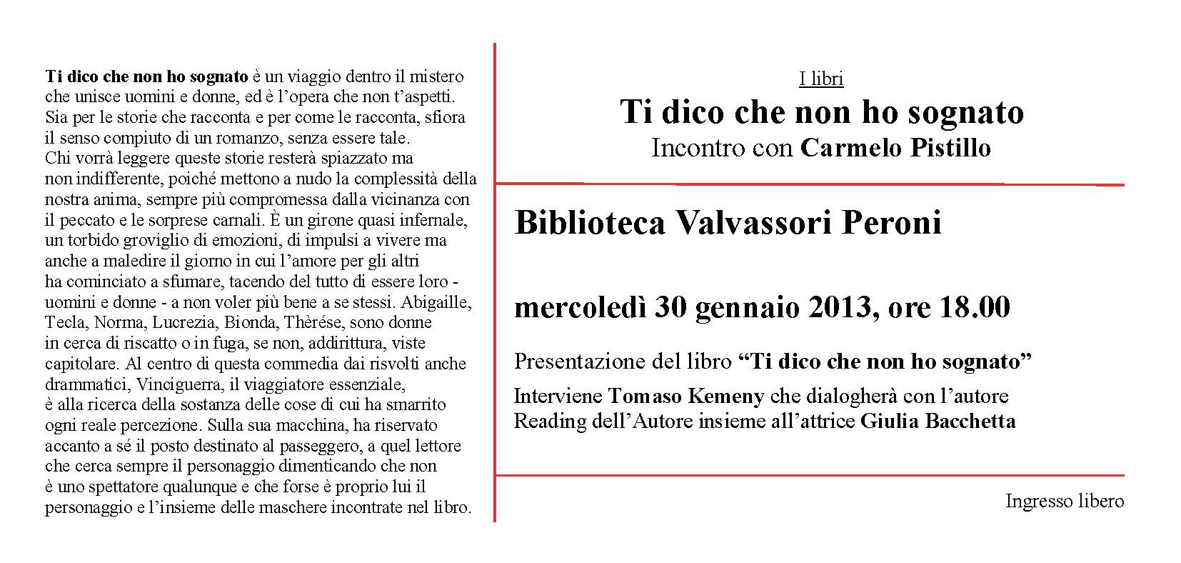 Ti dico che non ho sognato / Carmelo Pistillo. – Milano . Bietti, 2012. – 137 p.; 21 cm è ammesso al prestito presso la biblioteca. Collocazione: VAL.N.853.914.PIST