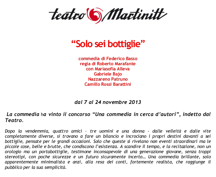 Questa voce è stata pubblicata in TEATRO e contrassegnata con Camilla Rossi Barattini, Federico Basso, Mariasofia Alleva, Nazzareno Patruno, ROberto Marafante. Contrassegna il permalink.