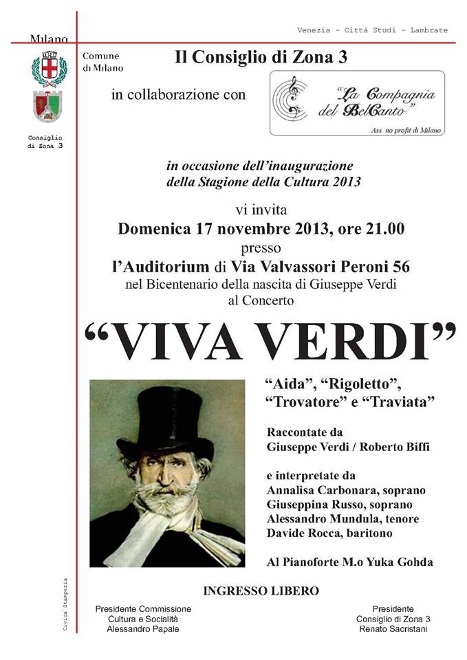 La delibera prevedeva che lo spettacolo si chiamasse Viva Verdi e il Tricolore ma, forse per questione di impaginazione delle locandine, il Tricolore è sparito (qualcuno dice che c’è di mezzo la Lega altri che se si indicava il Tricolore poi bisognava addobbare l’auditorium con lo stesso e si sforava il budget).