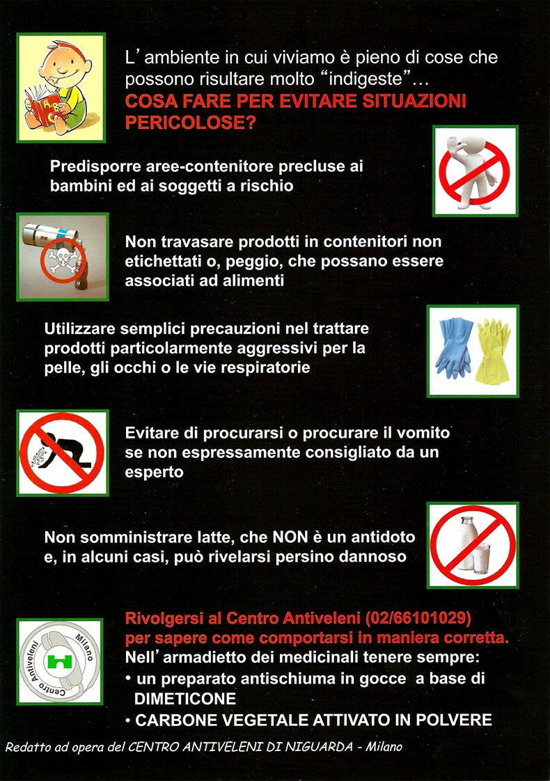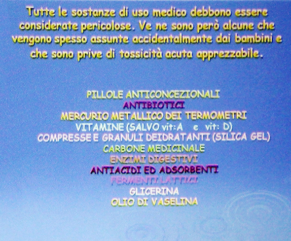 Il messaggio più volte ripetuto è stato: se vs. figlio o i vs. figli hanno ingerito cose “indigeste” non esitate a rivolgervi al Centro Antiveleni, attivo 24 ore su 24, e fatelo indicando con precisione quando ha ingerito la sostanza “indigesta”, cosa ha ingerito, in quali quantità.