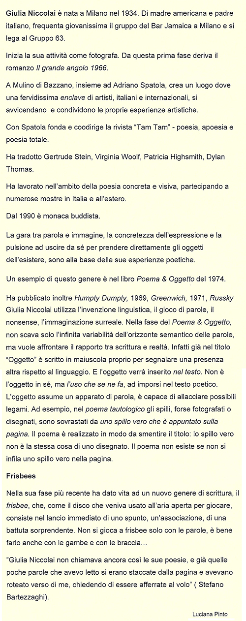 Giulia Niccolai non era presente all’inaugurazione della mostra che, per quanto la riguarda, presenta parte di due testi GIULIA NICCOLAI Humpty Dumpty 1969 (presente in formato pdf nell’archivio Maurizio Spatola) e Giulia Niccolai Poema & Oggetti 1974