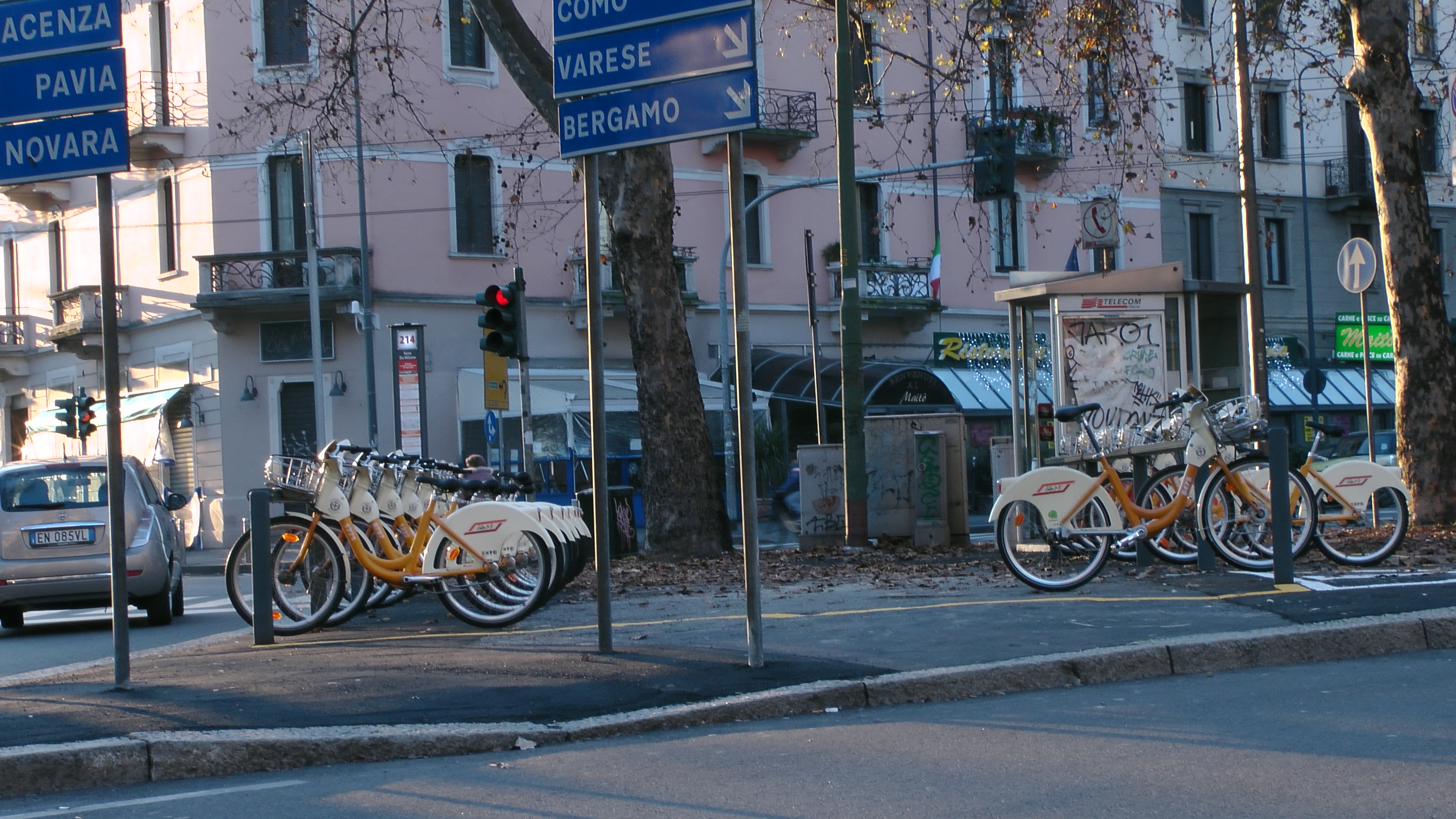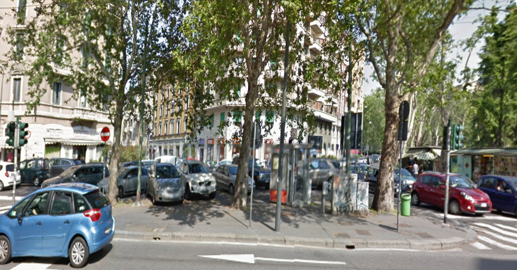 La stazione bike sharing N 214 Susa. A sinistra la strada porta a corso Plebisciti o in viale Romagnai; a destra in via Sidoli o in viale Romagna. Le macchine vengono da viale Argonne.