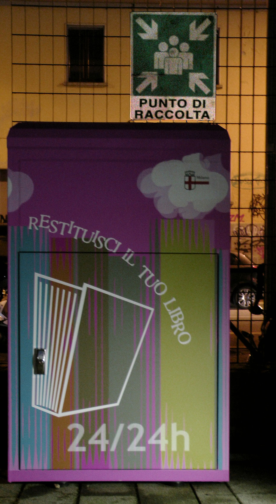 In ogni caso sulla cancellata, visibile dalla strada, sopra la feritoia praticata nell’inferriata, sarebbe utile che vi fosse un cartello con l’indicazione che il contenitore serve per restituire libri, riviste e cd.
