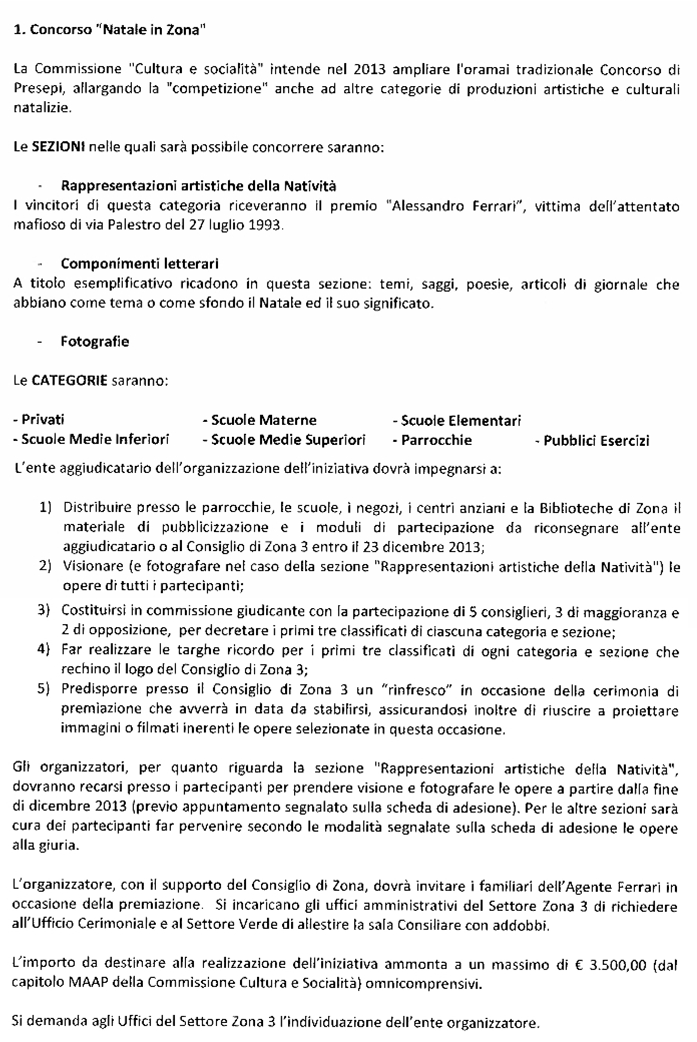 “Lunedì 20 gennaio 2014 alle ore 17.15 presso la sala cosiliare del Consiglio di Zona 3 in via Sansovino, 9 ci sarà la premiazione del 1° Concorso “Natale in Zona” Presepi – Componimenti letterari _ Fotografie. Il concorso è intitolato al Vigile Urbano Alessandro Ferrari vittima dell’eslposione di via Palestro”