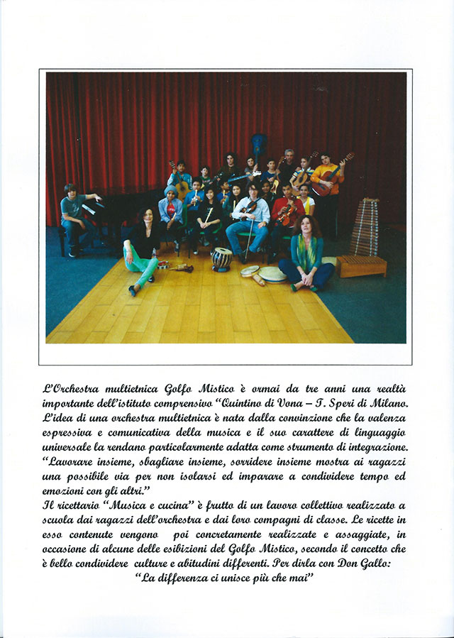 Chi lo volesse può richiedere i ricettari multietnici: arricchirà la sua cultura culinaria e aiuterà l’Orchestra, pagandone un prezzo a sostegno dell’Orchestra.