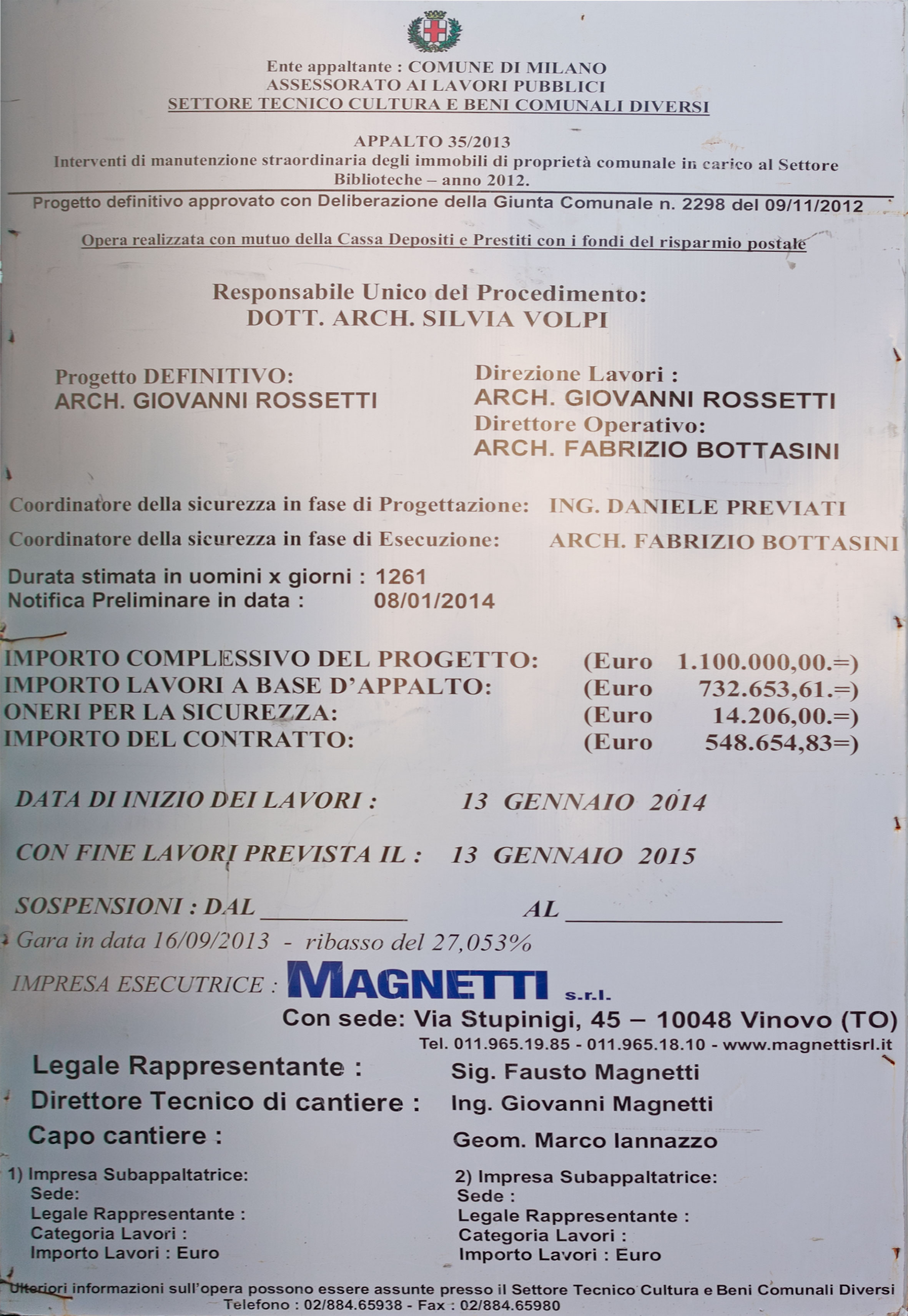 E allora, obtorto collo, a cancello chiuso abbiamo fotografato il cartello e ne abbiamo elaborato l’immagine così che tutti possiate rendervi conto che i lavori che verranno effettuati riguarderanno solo quelli deliberati dalla Giunta Comunale in data 9/11/2012 e che erano necessari alla data dell’aggiudicazione dell’appalto: il 16 settembre 2013.