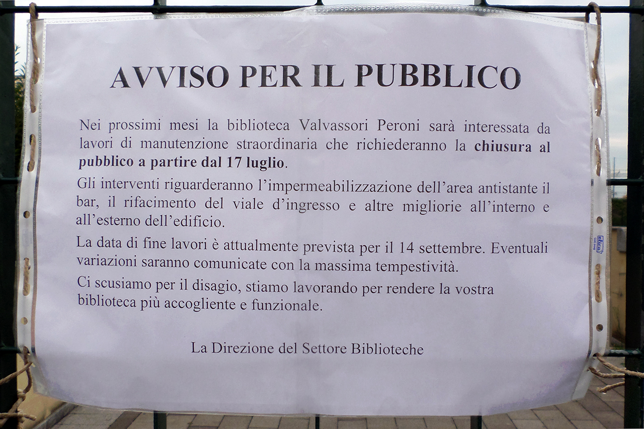 Poi forse perché avevamo chiesto di sapere, forse perché si sentivano in dovere di rispondere alle numerose sollecitazioni degli utenti della biblioteca, fatto sta che oggi (12 settembre) la DIREZIONE SETTORE BIBLIOTECHE che fa capo al dott. Stefano Parise ha inviato agli utenti della biblioteca Valvassori Peroni il seguente comunicato.