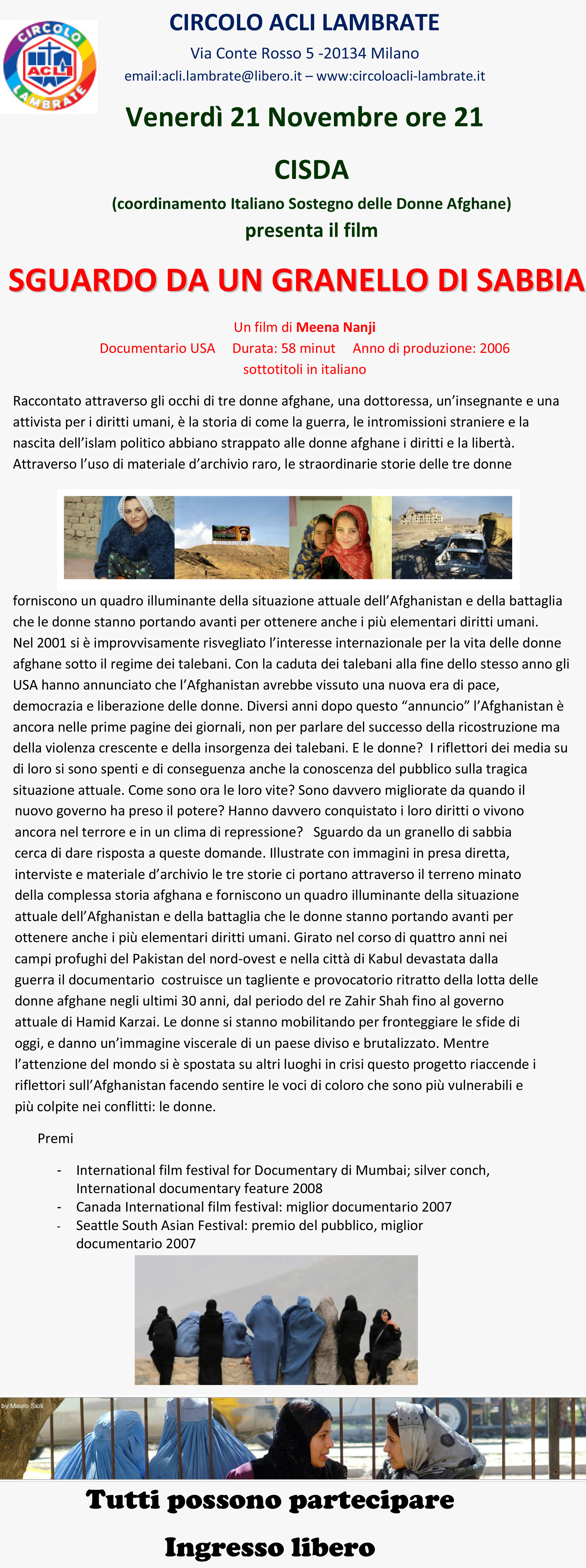 Questa voce è stata pubblicata in Cineforum e contrassegnata con Acli Lambrate, CISDA, coordinamento itagliano sostegno donne afgane, Meena Nanji, SGUARDO DA UN GRANELLO DI SABBIA. Contrassegna il permalink.