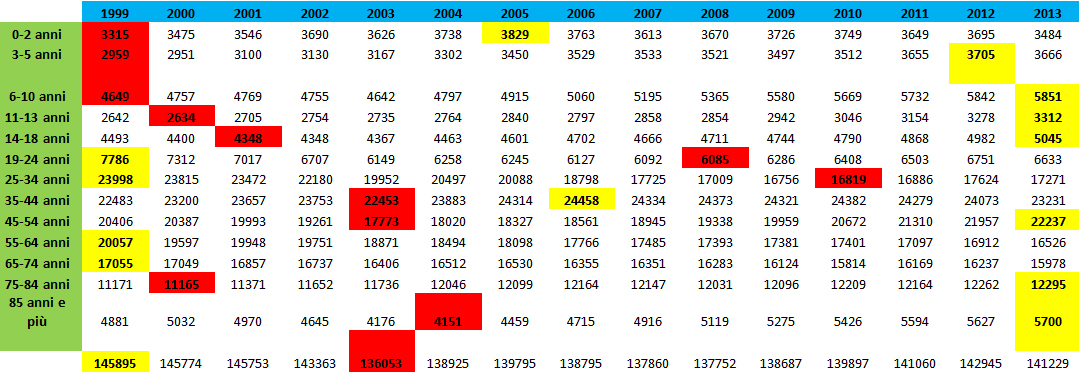 Il dato evidenziato in rosso indica in quale anno si è avuto il minor numero di residenti per la fascia di età di riferimento: quella indicata nella prima colonna a sinistra.