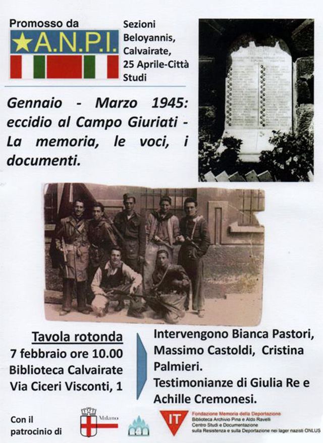 Nella conferenza che terremo il 7 febbraio alle ore 10 presso la Biblioteca Calvairate ripercorreremo queste vicende grazie ai recenti studi basati su interviste e documenti processuali e raccoglieremo le testimonianze di Giulia Re, giovane staffetta che partecipò ai funerali clandestini dei giovani fucilati, e Achille Cremonesi, che con loro condivise l’esperienza carceraria. Infine verrà presentato il nuovo monumento che l’Anpi zona 4 installerà presso il Campo Giuriati per il 70° della Liberazione.
