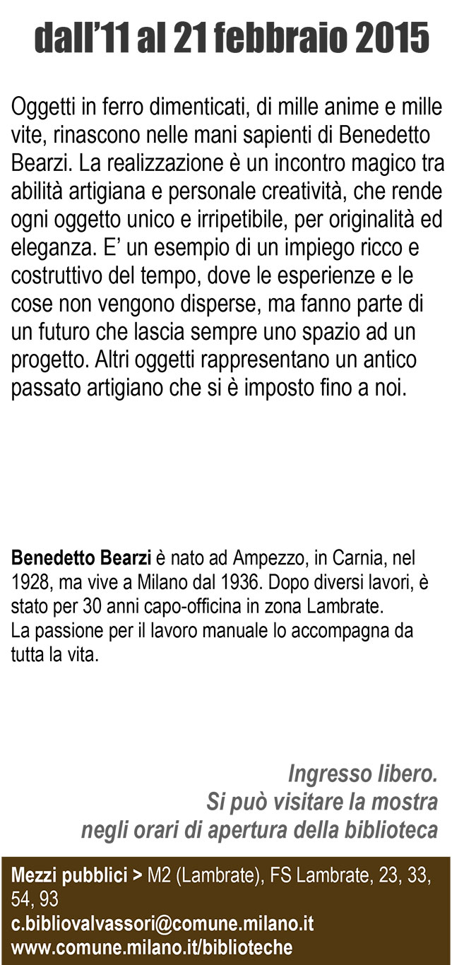 Questa voce è stata pubblicata in Biblioteca Valvassori Peroni, Mostra e contrassegnata con Benedetto Berzi, La magia del ferro. Contrassegna il permalink.