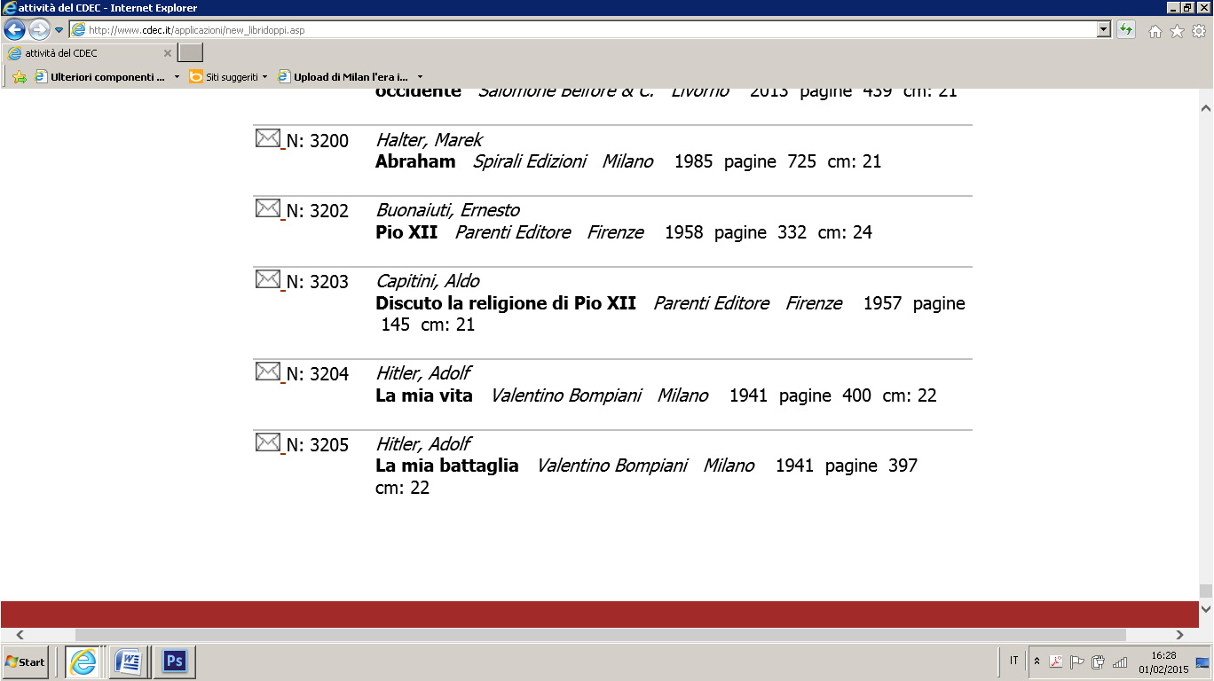Abbiamo così appreso che “La Biblioteca della Fondazione CDEC dispone di una serie di opere doppie che scambia o cede, dietro libera offerta. Attualmente sono disponibili 2343 libri sulla storia e la cultura ebraica, italiane e straniere, recenti e meno recenti. Per consultare l’elenco completo dei nostri libri doppi, clicca qui” .