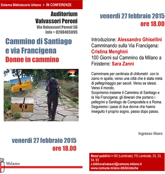 Questa voce è stata pubblicata in Auditorium, Biblioteca Valvassori Peroni, incontri e contrassegnata con Alessandro Ghisellini, Cammino di Santiago de Compostela, Cristina Menghini, Sara Zanni, Viai Franchigia. Contrassegna il permalink.