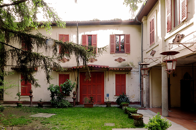 La corte con il porticato puntellato da tubi Innocenti