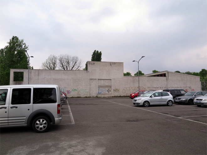 Il parcheggio in fondo a via Cazzaniga e la facciata della Casa dell’acqua rigorosamente senza porte e finestre, come si presenta oggi.
