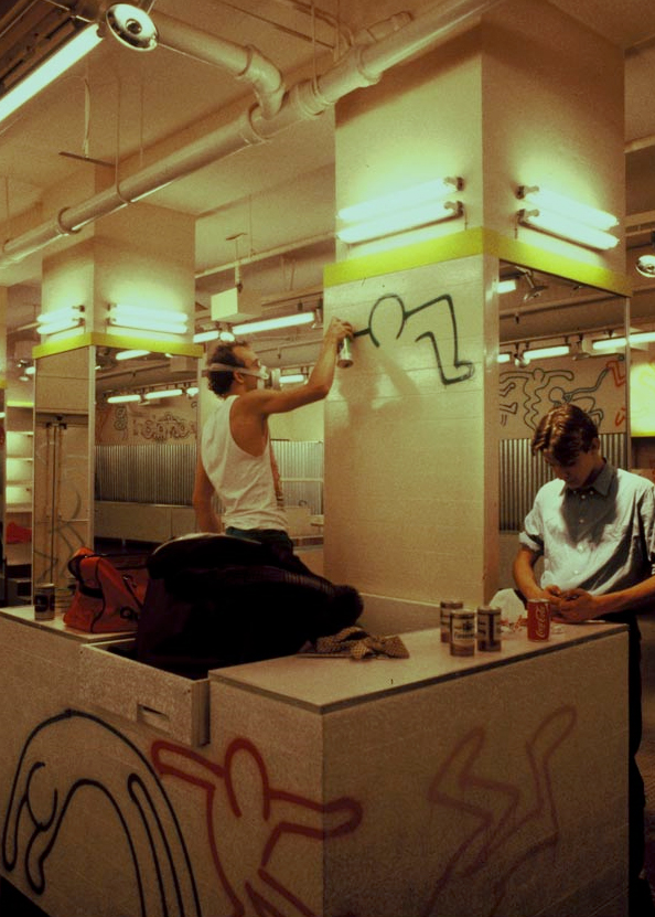 Elio Fiorucci invita a Milano Keith Haring. Haring lavora due giorni e una notte trasformando il negozio Fiorucci di Galleria Passarella, pareti e mobili del negozio vengono “rivestiti” con la sua creatività, le opere saranno poi vendute all’asta.