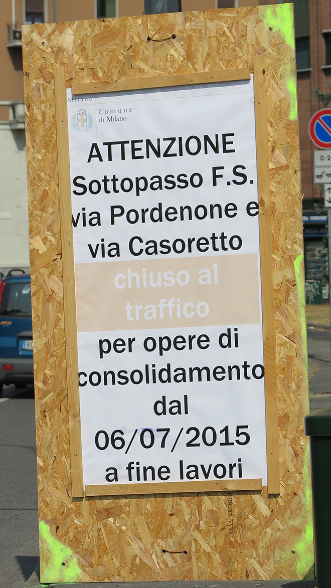 Da inizio di luglio su tutte le vie e le piazze che portano al sottopasso di via Casoretto/Pordenone compare lo stesso cartello.