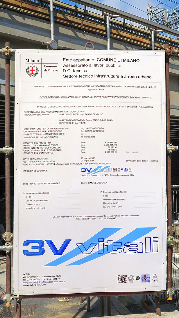 Il cartello della ditta appaltata era prodigo di informazioni: il progetto esecutivo era stato approvato con determina dirigenziale e il funzionario che aveva dato incarico di stampare i cartelloni di inizio lavori non si è dato pena di specificare quando sarebbero finiti. Ma tra le tante informazioni abbiamo trovato la risposta alla domanda che più ci premeva: