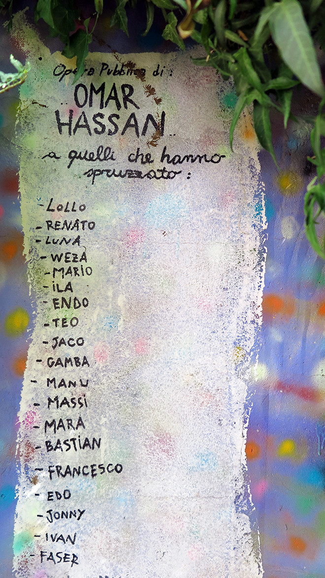 L’opera come indica la scritta, che si trova su un lato del giardino è stata dedicata “in particolare a Marco Zuanazzi, in arte Kiere”.