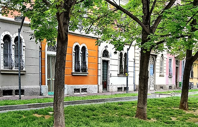 Ma qualche dubbio sorge riferendoci al comportamento dei piccioni di ogni specie e razza. Di fronte alla scuola, al monumento, alla fontana, dall’altra parte della piazza, ci sono non già un filare d’alberi, ma un doppio filare, e delle “villette” d’epoca, dipinte con diversi colori, e disdegnate da piccioni di ogni specie e razza.