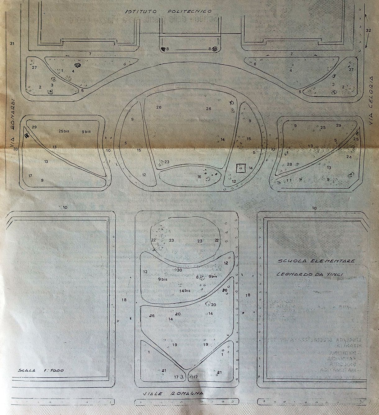 Sul finire degli anni ’70 un professore di Agraria fece svolgere ai suoi studenti una ricognizione del patrimonio arboreo di piazza Leonardo da Vinci e realizzò un censimento delle piante che vi erano a dimora. Lo studio è stato proposto nell’aprile del 1981, da un giornale di zona: La Piazza.