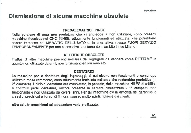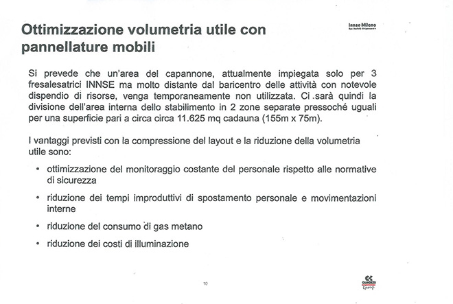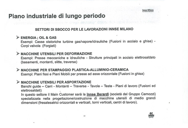 Qui di seguito riproduziamo le diapositive di presentazione del Piano di Rilancio dell’attività produttiva del sito di via Rubattino 81 dove opera la INNSE Milano Spa che acquisita nel 2009 dal Gruppo Camozzi di Brescia.