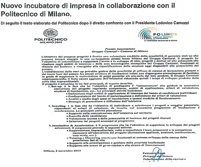 Dopo la presentazione sintetica del Piano di Rilancio della INNSE di via Rubattino la RSU di INNSE, tra le varie affermazioni riportate, ha voluto capire come dovessere essere inteso ciò che compare a pag. 15: un semplice elaborato del Politecnico, commissionato da Lodovico Camozzi, o la possibilità concreta di un coinvolgimento del Politecnico per fare nascere su parte del capannone della INNSE un incubatore di impresa.