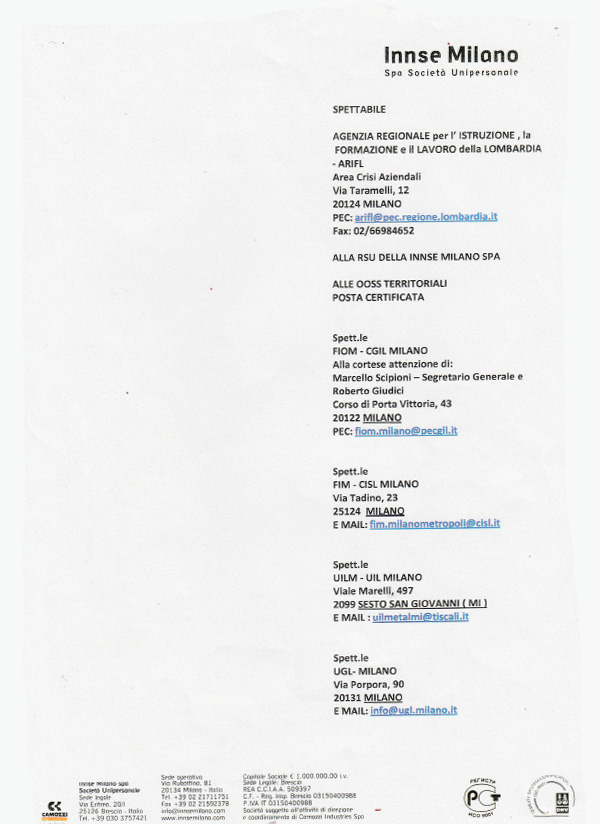 • 20 marzo LA INNSE MILANO SPA E LA COMOZZI INDUSTRIES SPA CONDANNATE A PAGARE UNA RISARCITORIA DI 20 MENSILITA’ A MASSIMO MERLO