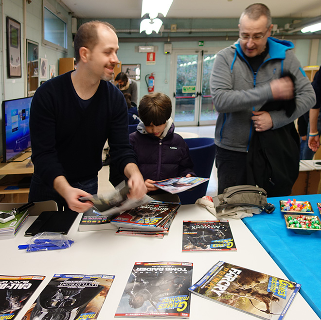 Emanuele Cabrini di GameSearch.it ha dato la consulenza per la realizzazione della GamingZone qui è insieme a Claudio (keiser) Todeschini (con figlio) direttore di The Games Machine