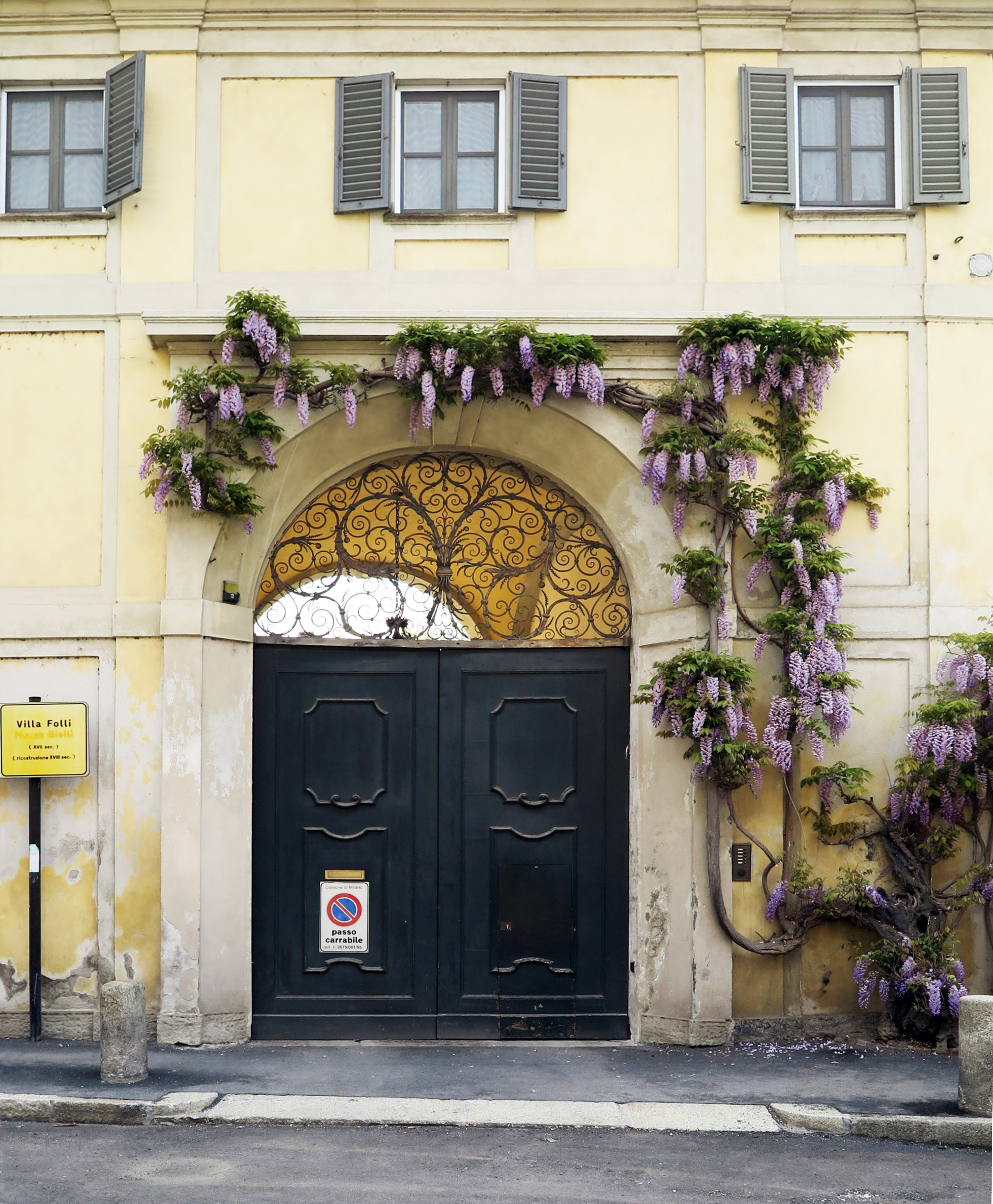 Portale sormontato da un glicine e da una griglia in ferro battuto
