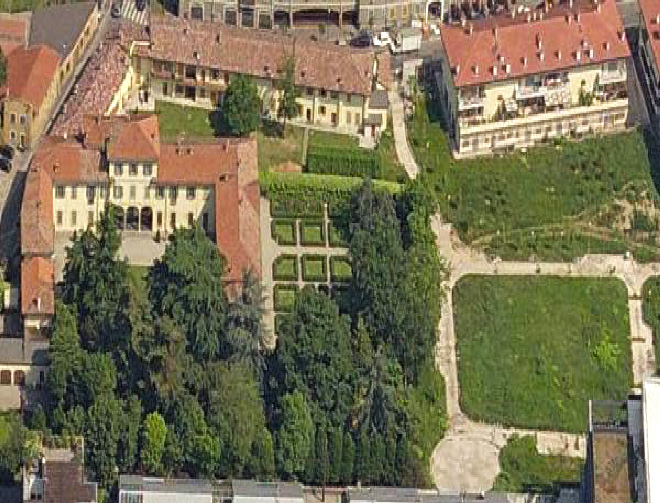 Veduta aerea della Villa, che oltre ad avere un parco/giardino ha anche un giardino a labitinto. (foto primi anni ’80 tratta da una scheda di Lombardia Beni Culturali). A destra oggi vi è un giardino pubblico. (All’epoca in fase di realizzazione.