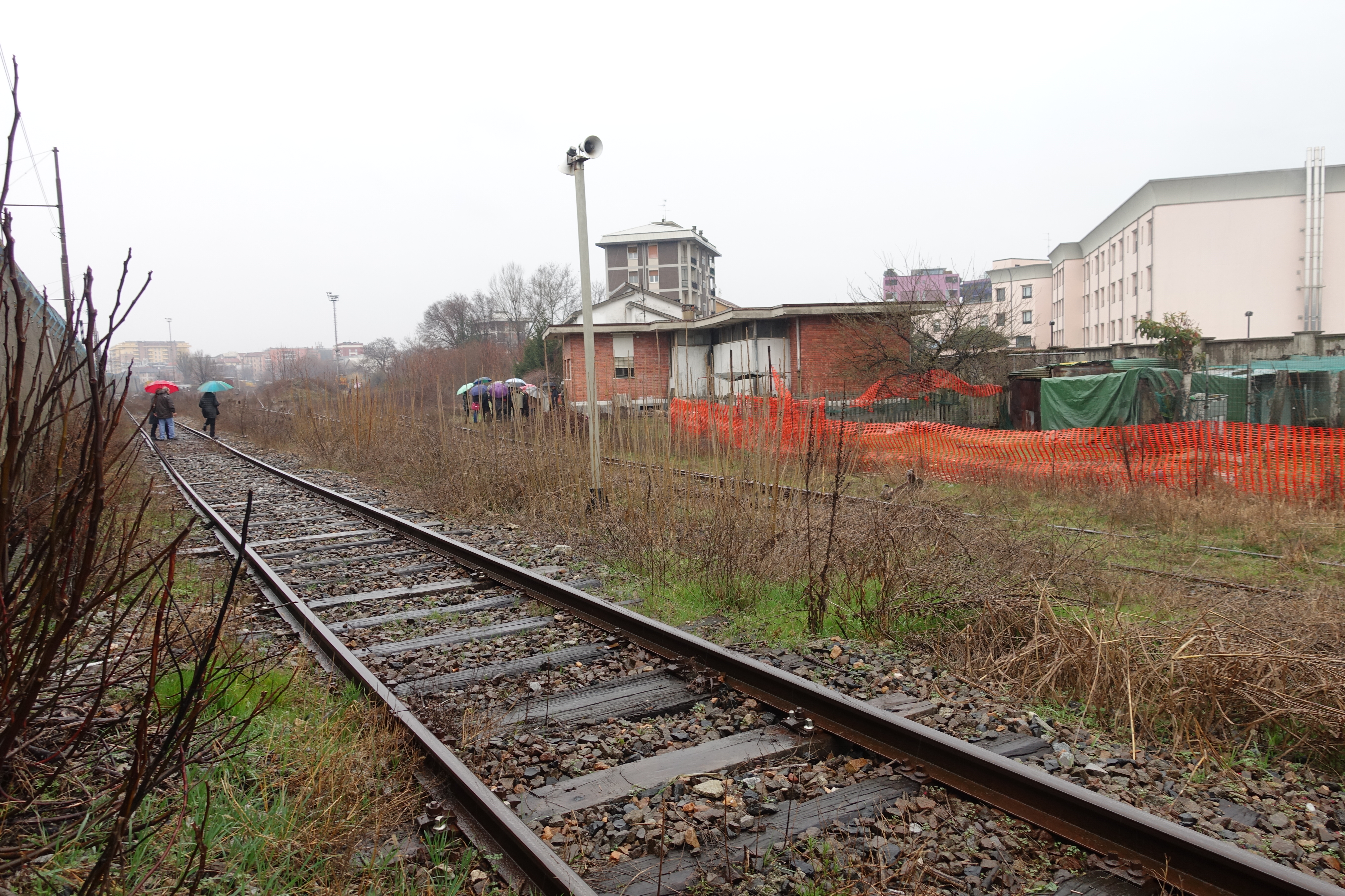 La rampa che va sul cavalcavia di via san Faustinocon un binario in disuso