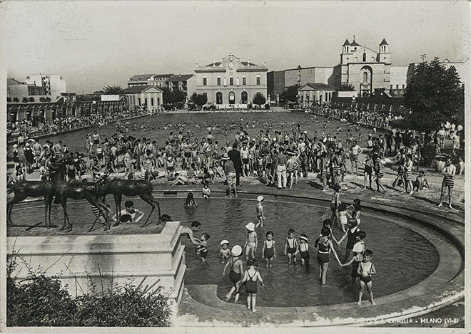 Guardate questa foto. E’ stata scattata probabilmente nel 1936. In primo piano appaiono sul bordo dell’allora piscina dei bambini della Piscina Ponzio 3 gazzelle, diventate all’epoca della loro scompara 3 antilopi.*