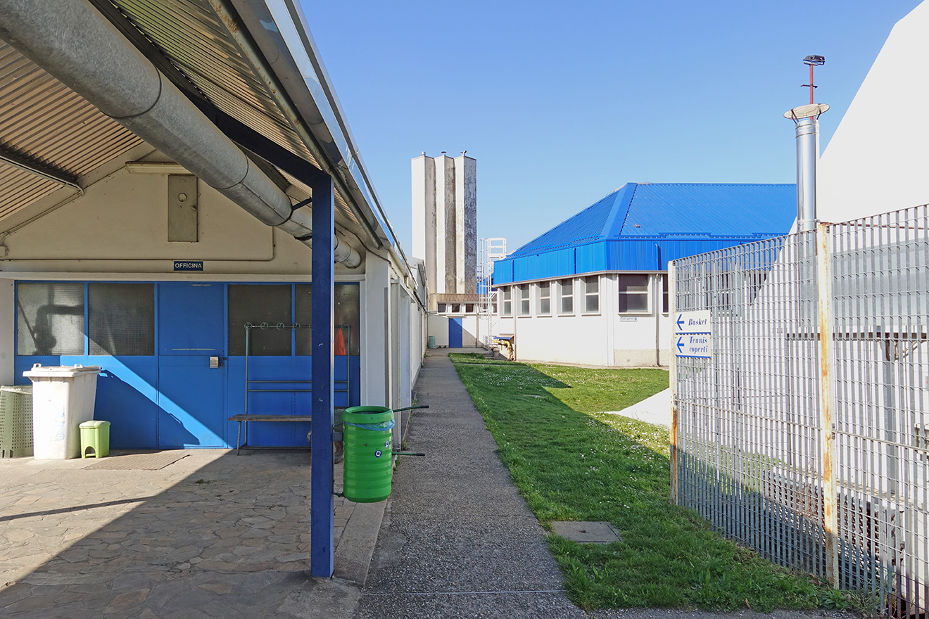 A sinistra i locali in cui verrà realizzata una piccola palestra per ginnastica dolce. In fondo i camini della centrale termica e a destra una delle due palestre