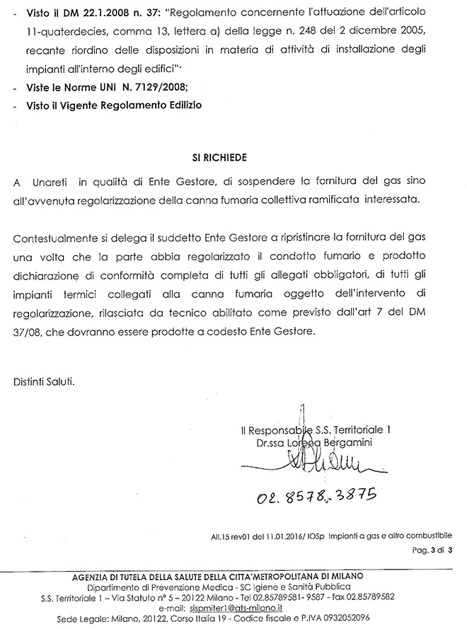 Come se la cosa fosse la più naturale nel mondo occidentale mi risponde: sì. E mi consiglia di trovarmi un idraulico che mi metta a norma e mi certifichi l’impianto: peccato che alla mia canna fumaria sono attaccati altri 8 condomini e i tempi di rifacimento della canna fumaria, come proposto dalla dott.sa Lorena Bergomi, mi fanno pensare che morirò d’inedia.