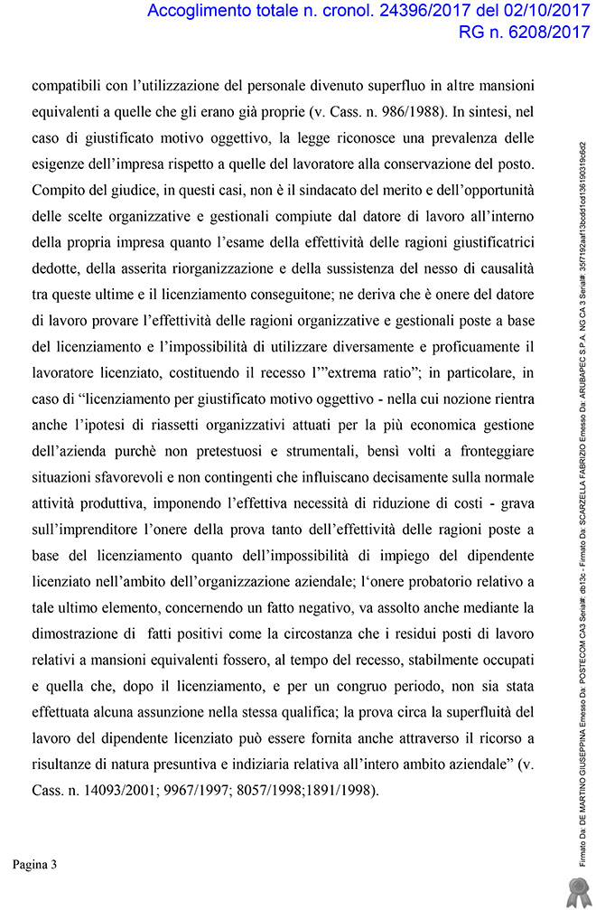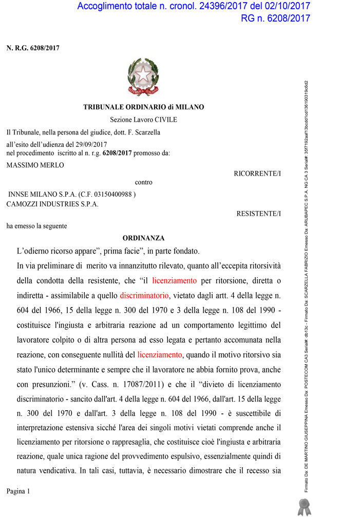 Con sentenza depositata il 02/10/2017 n.rg. 6208/2017 il Tribunale ordinario di Milano – Sezione Lavoro Civile, nella persona del giudice dott. Fabrizio Scarzella, ha emesso la seguente ordinanza: