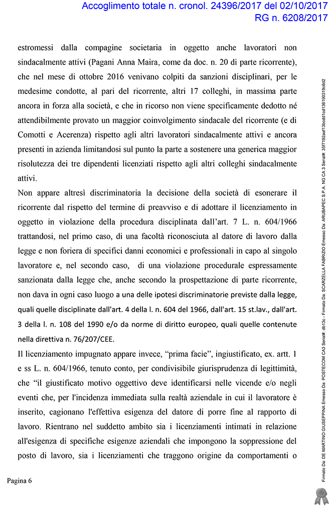 Ma il suo licenziamento, secondo la tesi difensiva sostenuta dai suoi avvocati, oltre ha non avere una motivazione fondata su fatti aveva una motivazione sindacale.