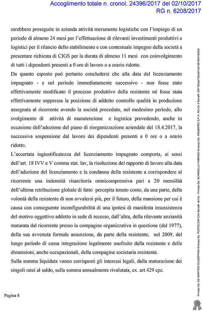 dichiara ingiustificato e, pertanto illegittimo il licenziamento intimato al ricorrente con comunicazione del 3.3.2017 e per l’effetto dichiara risolto il rapporto di lavoro alla data di efficacia del licenziamento e condanna Innse Milano spa, in persona del legale rappresentante pro-tempore, a corrispondere al ricorrente una indennità risarcitoria pari a 20 mensilità dell’ultima retribuzione globale di fatto percepita, oltre interessi legali e rivalutazione monetaria, oltre al rimborso dei compensi professionali liquidati in complessivi euro 2500,00, oltre accessori di legge;