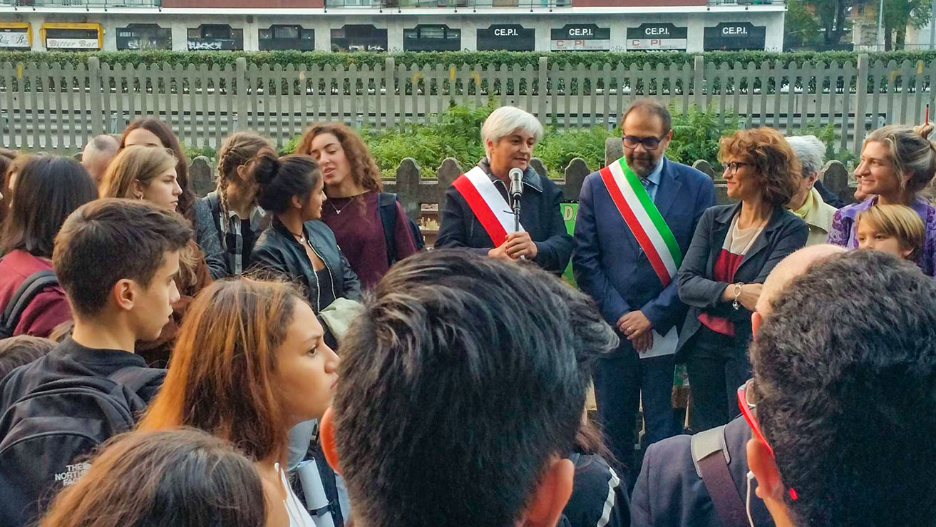 Al microfono la Presidente del Municipio 3 al suo fianco l’assessore Granelli e ancora l’assessore del municipio 3 Bruzzese