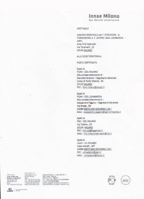 • 20 marzo LA INNSE MILANO SPA E LA COMOZZI INDUSTRIES SPA CONDANNATE A PAGARE UNA RISARCITORIA DI 20 MENSILITA’ A MASSIMO MERLO
