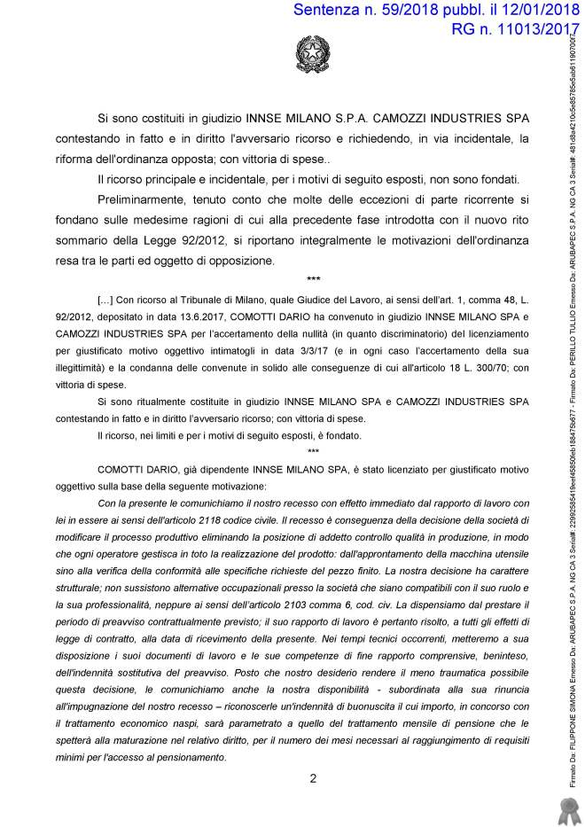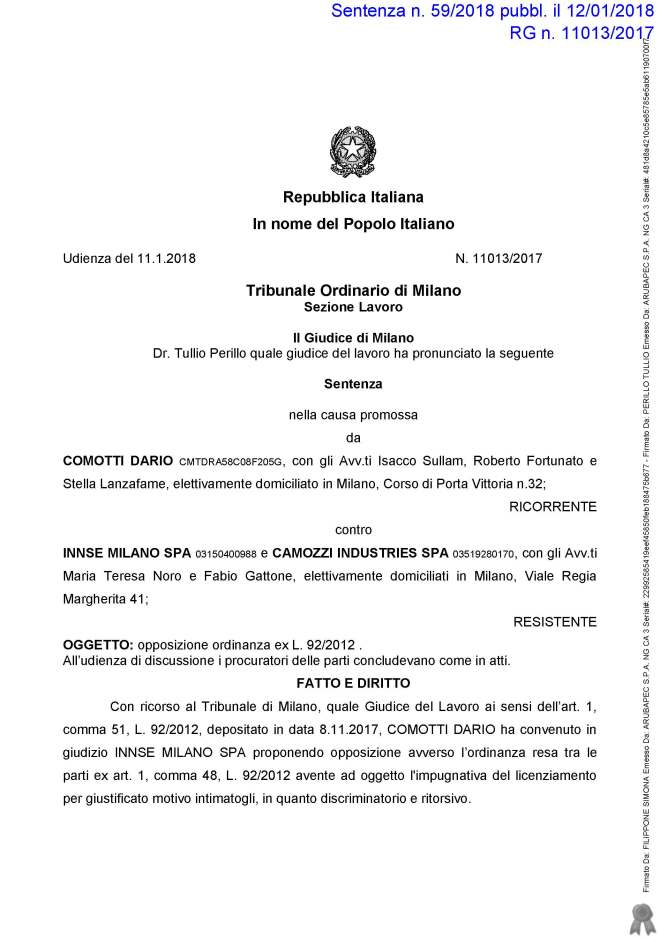 Con questa sentenza il Tribunale Ordinario di Milano Sezione Lavoro ha riconfermato l’illegittimità del licenziamento operato dall’INNSE Milano, di via Rubattino, nei confronti di Dario Comotti per violazione dell’onere di repèchage e ha condannato la INNSE a pagargli la somma complessiva di €. 58647,42, oltre interessi e rivalutazione al saldo effettivo. (vd. quanto disposto dallo stesso giudice in data 6 ottobre 2017)