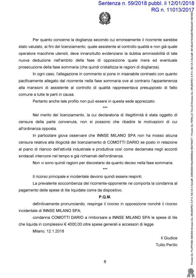 Quanto alle ulteriori questioni sollevate in giudizio non vi sono ragioni, a parere del giudice, per discostarsi da quanto da lui deciso nella fase sommaria e pertanto il ricorso e le sue incidentali sono state respinte e Comotti Dario è stato condannato a risarcire ad INNSE Milano Spa la spesa di lite che liquida in complessivi 4.000 euro.