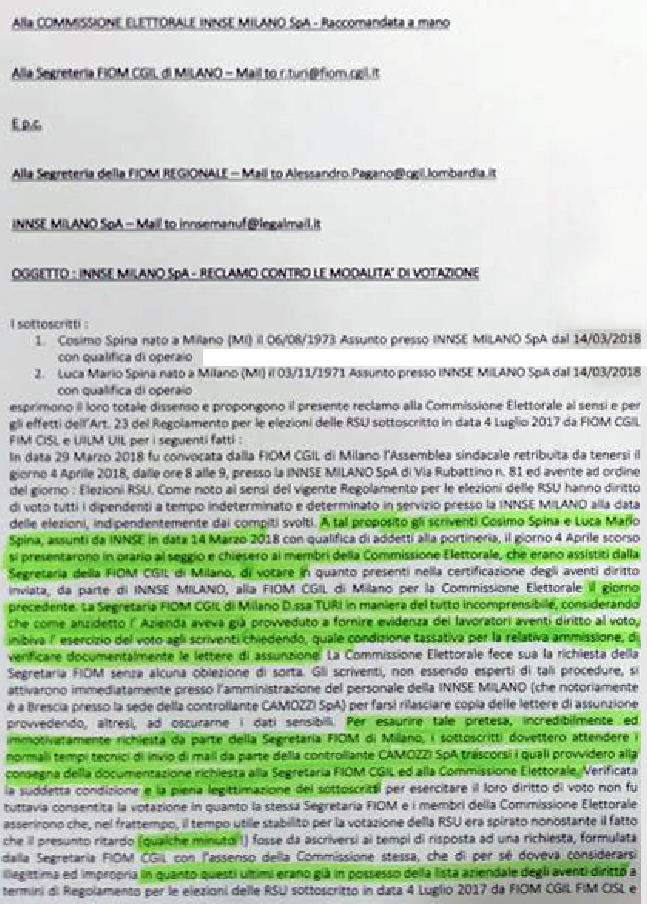 Alla commissione elettorale INNSE MIlano Spa … Di seguito riportiamo il testo